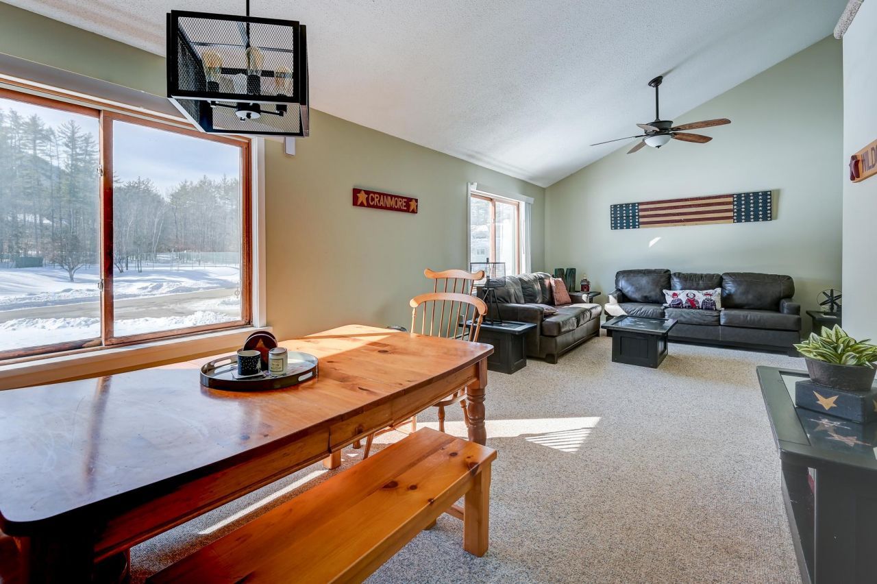 Experience elevated mountain living in this sun-drenched loft unit at The Seasons! This desirable townhouse style condo is ideally positioned to capture the most sunshine, filling the home with warmth and natural light through vaulted ceilings and expansive windows. The thoughtfully designed kitchen flows into the dining area and spacious living room, creating an inviting setting for entertaining or unwinding after a day on the mountain. The primary suite is spacious and has a private full bath with glass sliders leading to a covered deck, perfect for morning coffee or aprs-ski relaxation. A second bath and in-unit stackable washer and dryer complete the main level. The open loft provides additional sleeping or living space, ideal for kids, guests, a media lounge, or home office. Residents enjoy private locked storage and secure building access, along with a number of amenities: scenic walking trails; tennis, pickleball, and basketball courts; a pond with firepits and gathering areas; grill gazebo; playground; and a clubhouse featuring an indoor pool, hot tub, sauna, fitness area, and game room. Just minutes from Attitash Mountain Resort and 15 minutes to the shops and dining of North Conway Village, this turnkey, fully furnished condo offers a rare opportunity for effortless, year-round enjoyment in the heart of the Mount Washington Valley. Artwork is not included in the sale. On-site rental program available.
