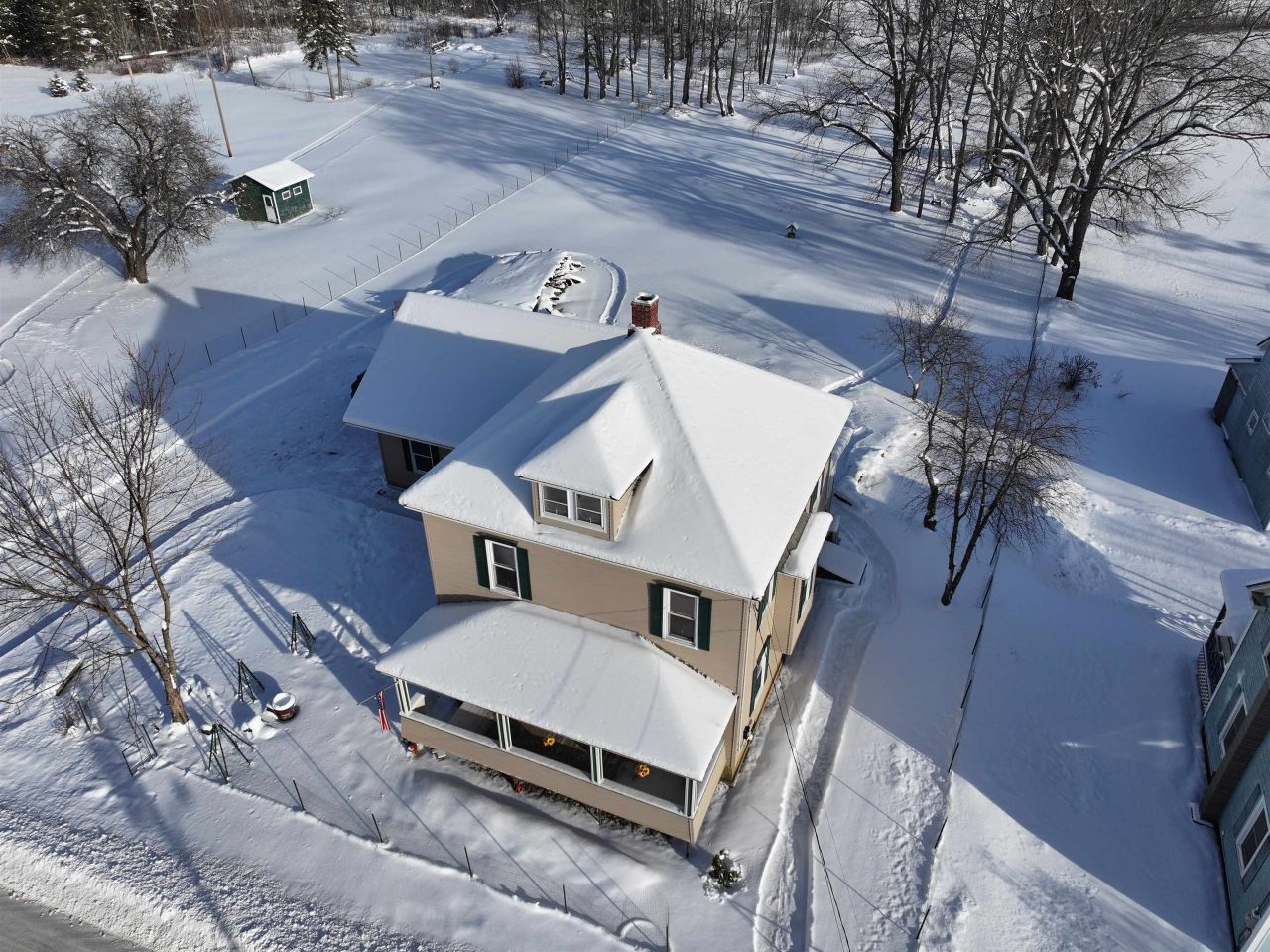 This colonial, four square, two story home sits on a big level lot at the edge of town. There is plenty of room for outdoor activities such as gardening, small animal husbandry, camping, putting, etc. You may also use your snowmobile or ATV right from your home. The two car garage with automatic door openers leads you right into the spacious, south facing sunroom/family room. At the door you have a spacious closet for your coats and boots. Adjoining the bright family room are the handy U shape kitchen with new appliances and the formal dining room. The living room is on the front of the house facing the covered porch. There is also a 3/4 bath and laundry room on the first floor. Upstairs you have 3-4 bedrooms and a full bath. The primary bedroom has two closets. Two of the bedrooms have laminate floors, and the other two rooms have original hardwood floors (that could use refinishing). One of the bedrooms has a built in Ethan Allen wall unit with a desk included. The woodwork is natural finish Ethan Allen hardwood. In 2025 the heat pump was added along with HVAC and forced air updates. All exterior walls have dense packed insulation. The entire attic has 18" of insulation. The full basement offers lots of storage and/or workshop space. There is a bulkhead for moving large items into or out of the basement, which has a newly done epoxy coated floor. The big level lot has a concrete pad on which you could build a barn or 2nd garage - the former structure burned. This property is ideal as a primary residence or a 2nd home close to lots of recreational opportunities in VT, NH, and Quebec.